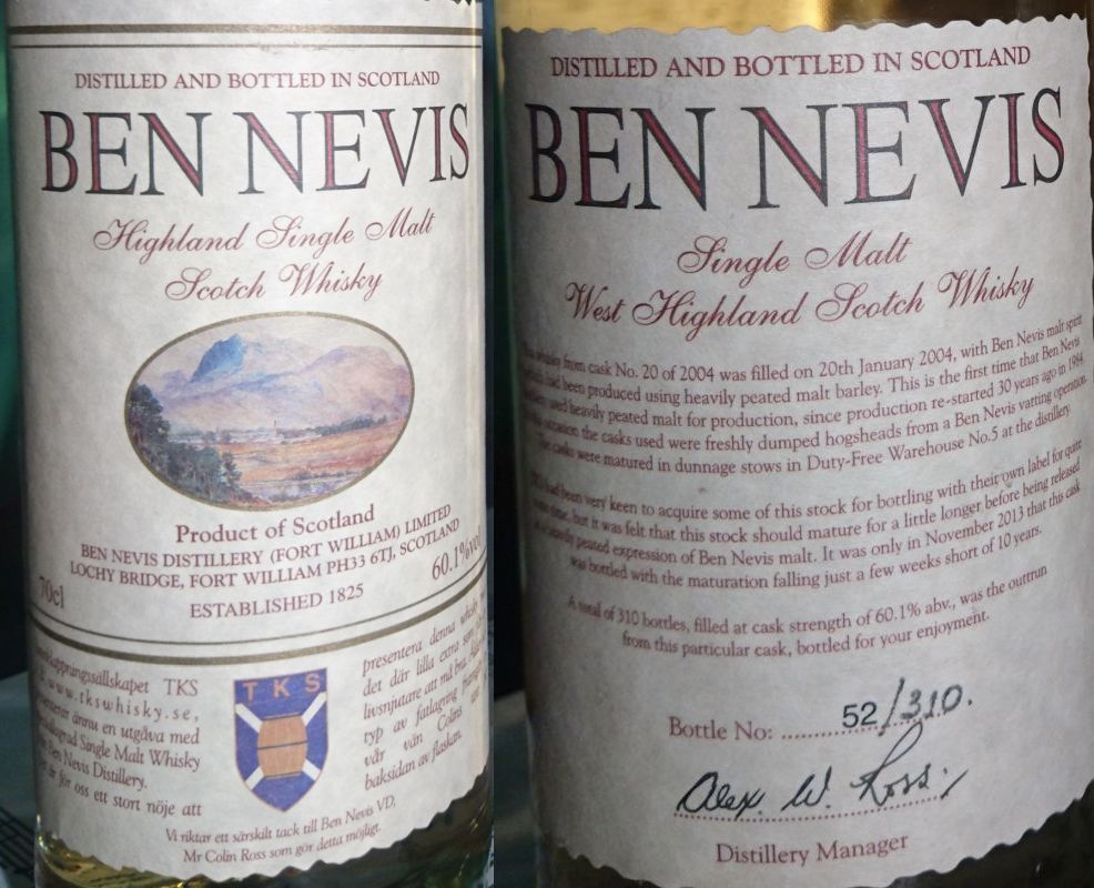 | Ben Nevis Highland Single Malt (tunnklappningssällskapet TKS) 9 yo, 0.70 liter, 60.1% Obenännbar. Bäst hittills. | ![]() | 0.67 liter |