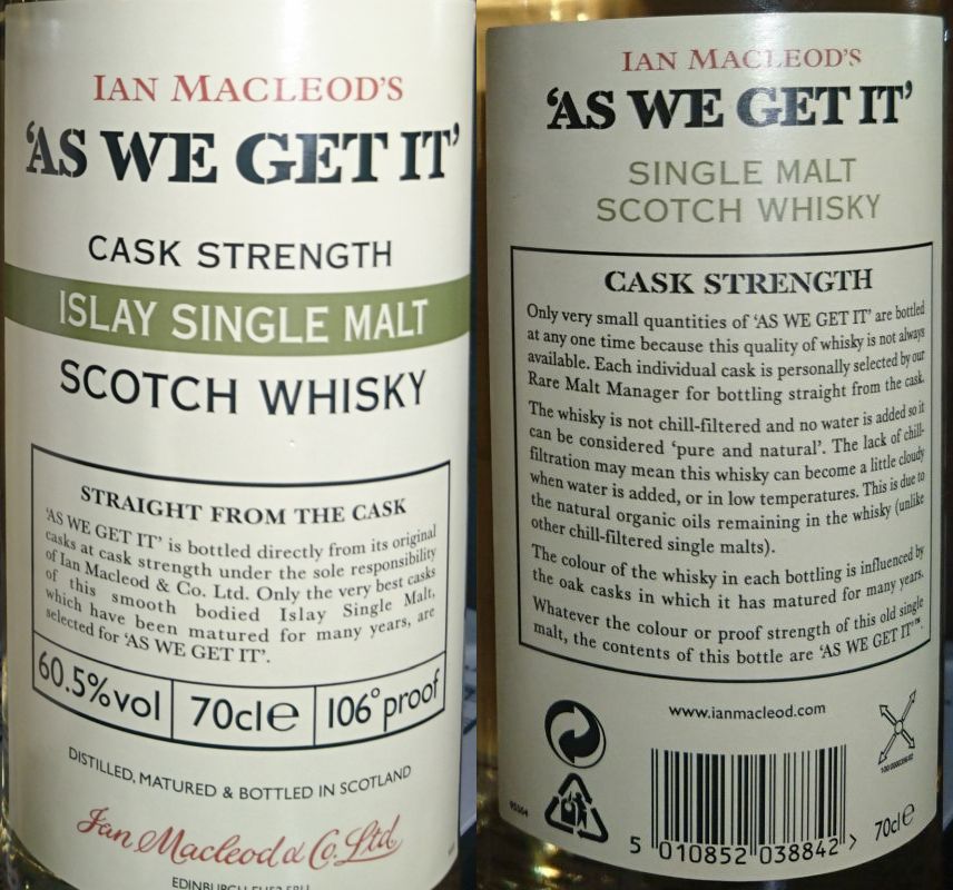 | As We Get It, Islay (Ian Macleod) 0.70 liter, 60.5% Rökig, riktig brasa. Ljus i färgen. | ![]() | 0.66 liter |